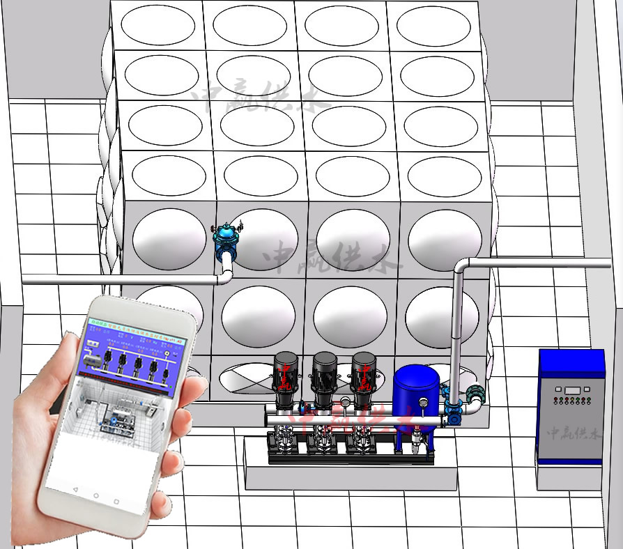 供水設(shè)備、服務(wù)器、智能手機(jī)通過Modbus通訊協(xié)議,對無負(fù)壓供水設(shè)備的運行情況進(jìn)行遠(yuǎn)程操控,以達(dá)到節(jié)能降耗、隨時隨地管理的功效。