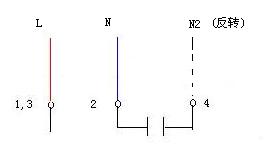 當兩繞組完全一樣,電機可能是三端子接線,1,3為兩繞組的公共接線端,接交流電源的L, 2/4端子之間聯(lián)有啟動電容, 如果交流電源的N端接端子2為正轉,則N改接端子4為反轉;如果是四端子,見圖四接線;